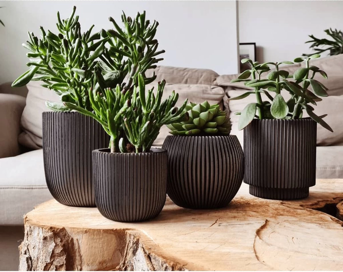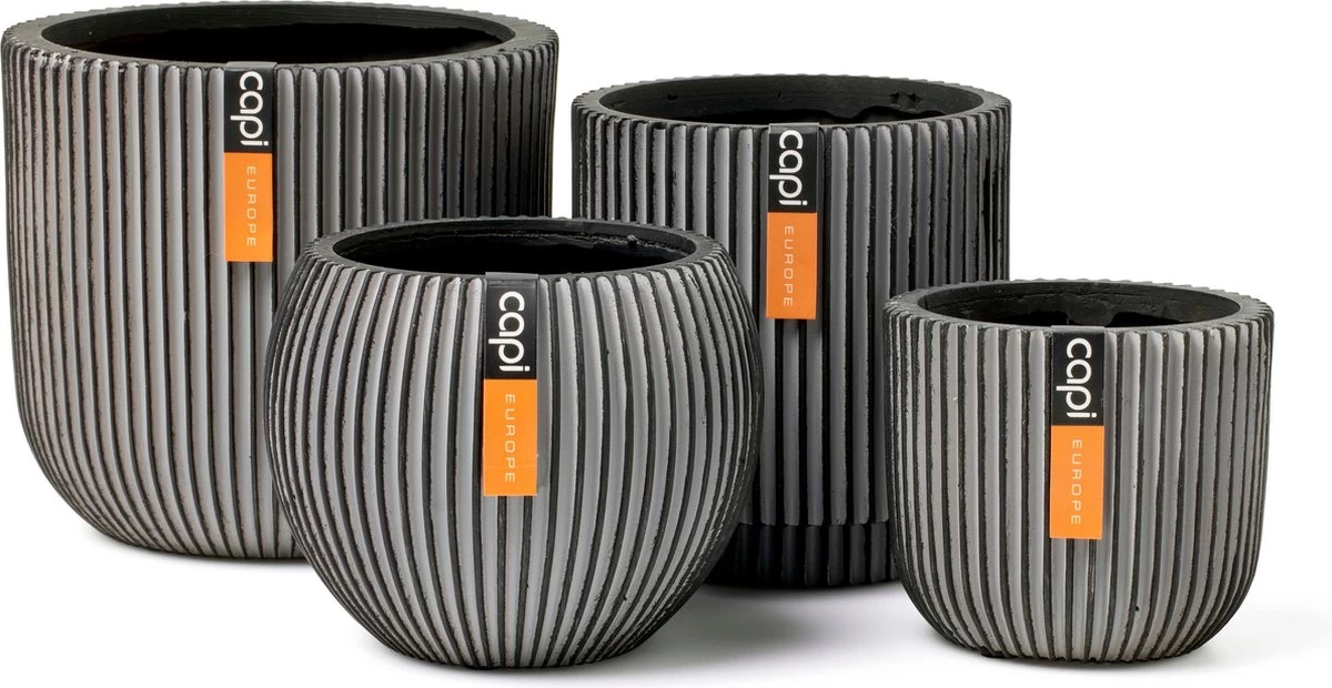 Deze set bevat 4 potten uit onze Nature Groove collectie. De Nature Groove is, zoals de naam al zegt, geïnspireerd op groeven. In het bijzonder is het geïnspireerd op de verticale groeven in rotsen en bergen die ontstaan door natuurlijke veranderingen in de loop der jaren. Het is een speelse en stoere collectie binnen onze indoor natuur-collectie. De antracietkleur combineert natuurlijk en modern zodat deze set in elk interieur past.