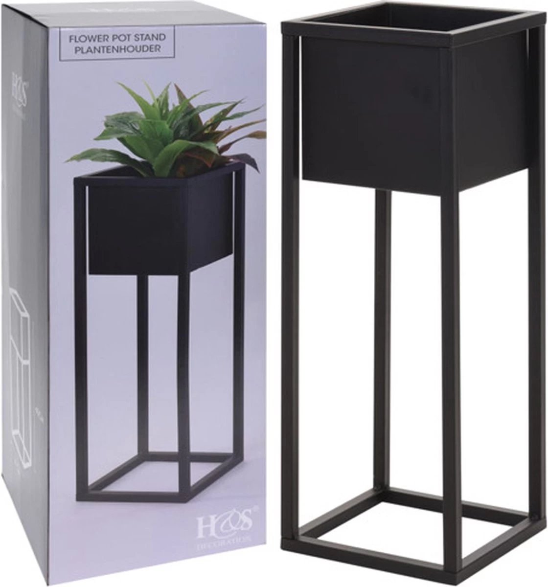 De verfijnde plantenbak van Home&Styling bestaat uit een bloempot op een stevige maar elegante standaard, beide gemaakt van zwart geverfd metaal.