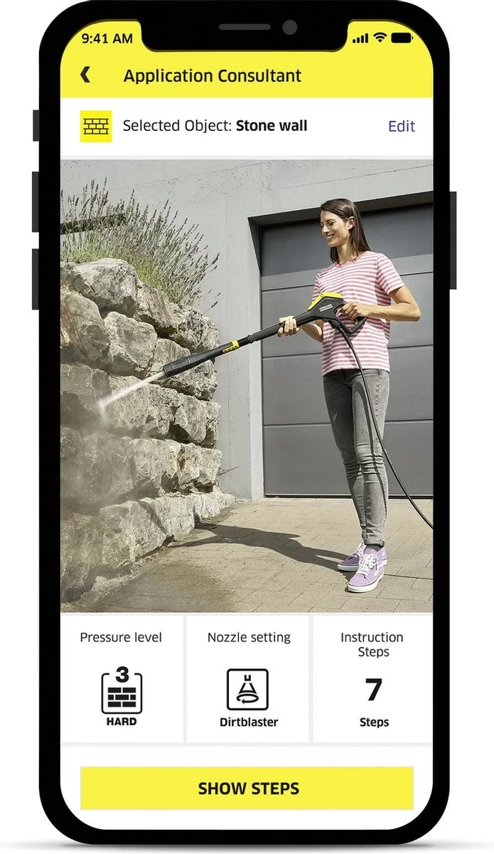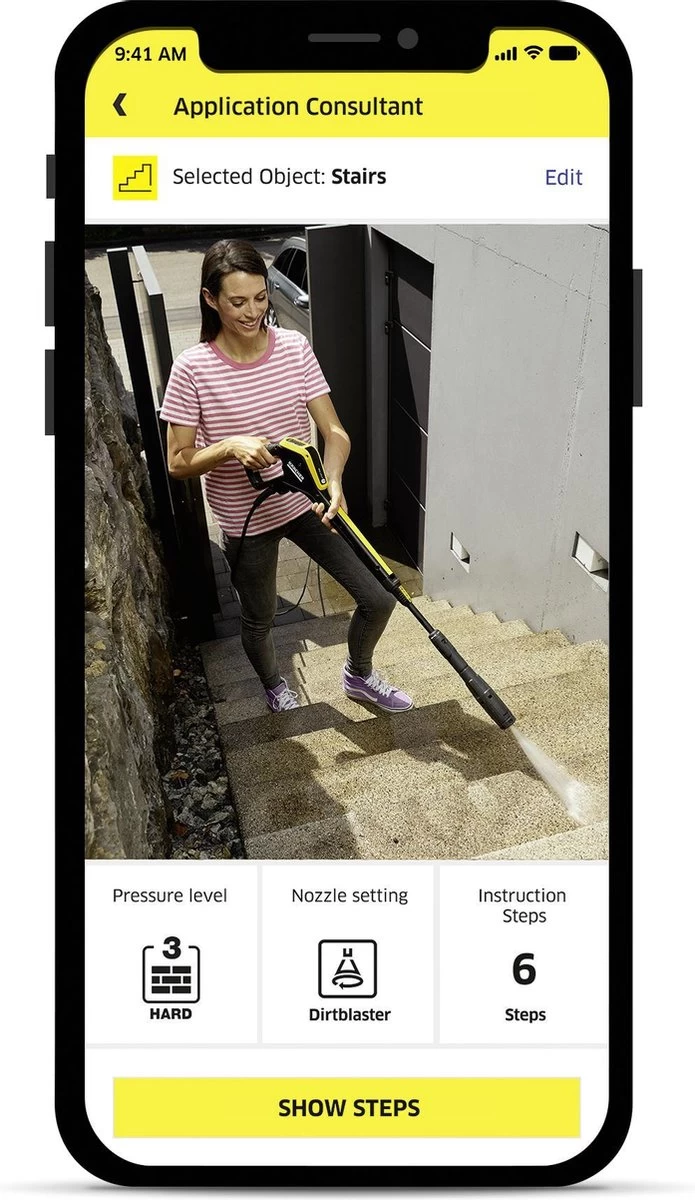 Verbind de hogedrukreiniger K 7 Smart Control eenvoudig via Bluetooth met de Kärcher Home & Garden-app op je smartphone – en het schoonmaken wordt veel eenvoudiger en efficiënter. Omdat de toepassingshulp in de app praktische tips en tricks geeft over veel schoonmaaksituaties en schoonmaakobjecten. De app biedt ook vele andere handige functies, zoals montage-instructies, verzorgings- en onderhoudsinstructies, evenals het Kärcher-serviceportaal.