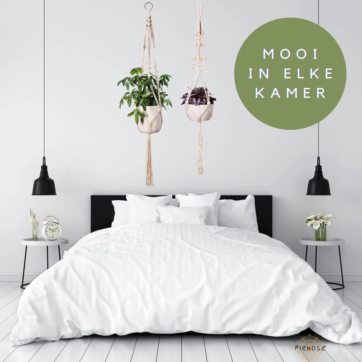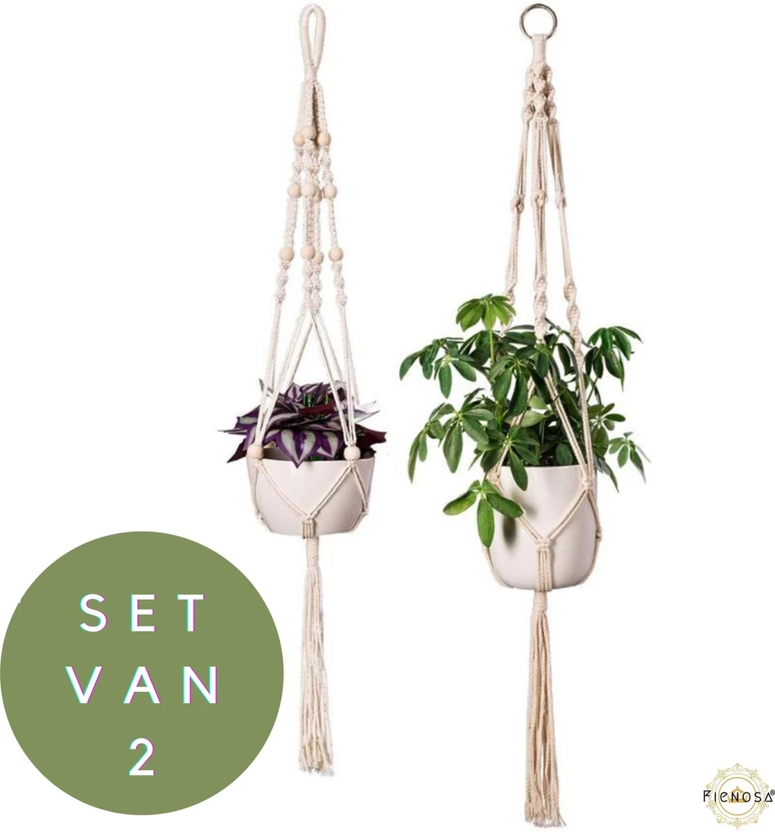 De Fienosa Macrame Plantenhanger is een kwalitatieve set geschikt voor 2 Bloempotten. Afgewerkt met knopen en er worden ophanghaken bijgeleverd