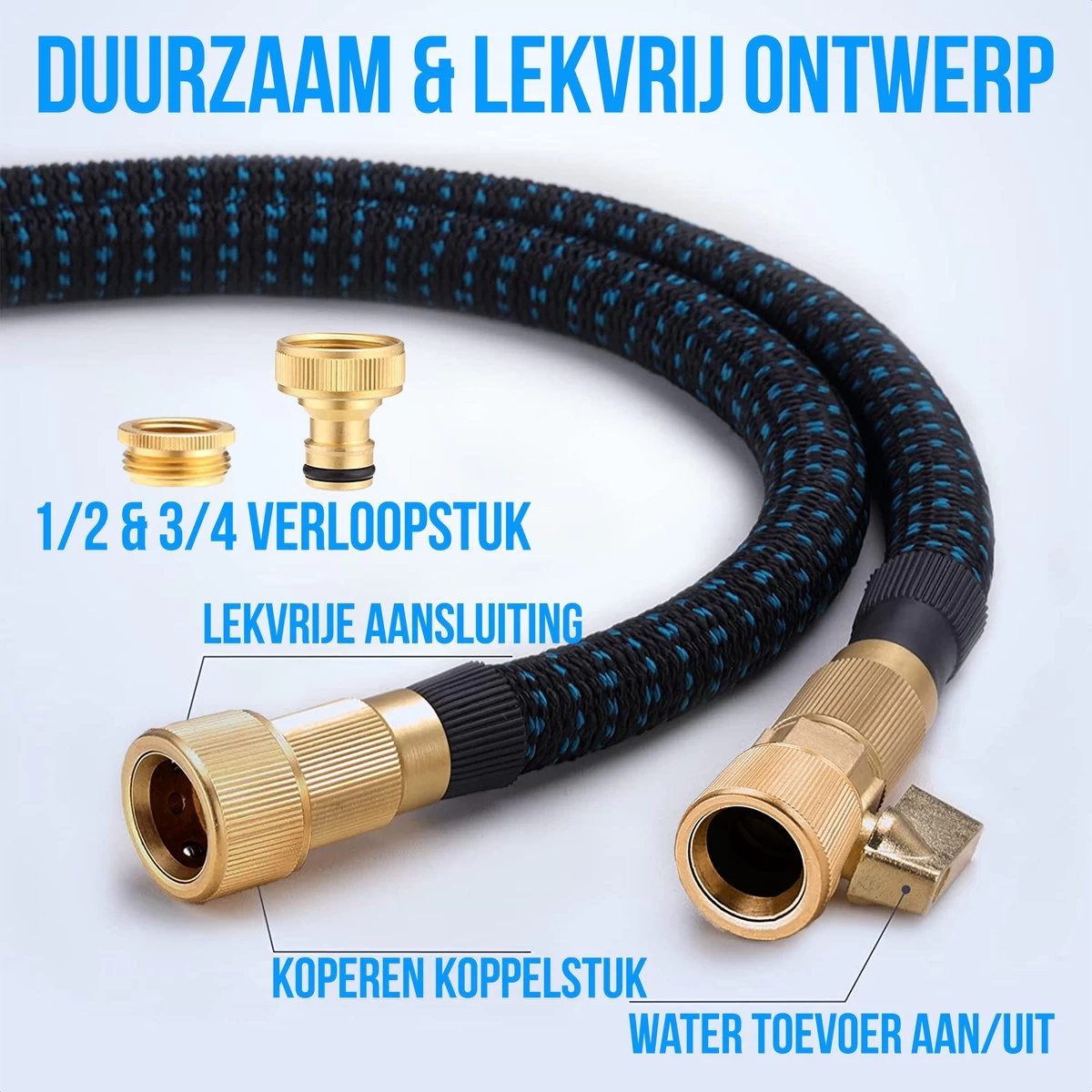 De tuinslang beschikt over een duurzaam en lekvrij ontwerp. Onder andere door de lekvrije aansluiting en het koperen koppelstuk, maar ook doordat je de watertoevoer eenvoudig afsluit. De koperen koppelingen en uitlaatkleppen gaan corrosie, barsten, scheuren, lekken en roest tegen. Ook dankzij het sterke 3750D polyester en een latex kern van maar liefst 4 lagen gaat de flexibele tuinslang ontzettend lang mee.