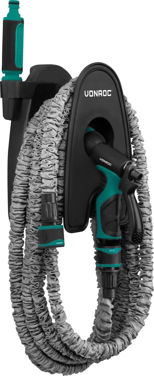 Deze tuinslang van VONROC is een heus wonder! Wanneer je de slang op de kraan aansluit wordt deze drie keer zo lang en bereik je een lengte van wel 20 meter. Wanneer je de kraan uitzet, krimpt de slang automatisch weer in. Zo is de slang gemakkelijk op te tillen én op te bergen op de meegeleverde muursteun. De steun is gemakkelijk aan de muur te bevestigen en de slang kan er zeer eenvoudig omheen worden gewikkeld.